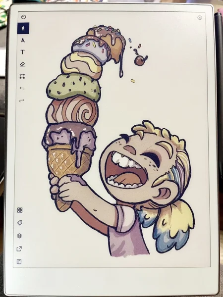 Boroda’s cartoony drawings on reMarkable Paper Pro practically leap off the Canvas Color display. In one, a young child balances a teetering tower of ice cream scoops in a waffle cone. In another, three attendants shovel gemstones into the jaws of a portly dragon.